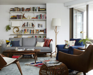 “Không gian chết” dưới gầm cầu thang được tận dụng để thiết kế hệ tủ kệ trang trí.
